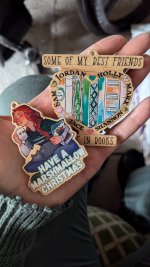 This is a wooden ornament with a colorful design on one side.