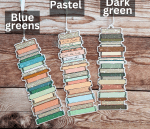 These beautiful bookmarks are handmade by a woman in Canada. I ordered them in bulk to make them available to my readers. These are made in a way that they can be written on. Write down the book you’re reading, and transfer it from one book to the next until it’s full! There are three shades: blue-green (richer colors,) pastels (lighter colors,) and dark greens (greens and browns.)