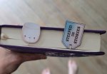 This is a double-sided, thick bookmark with a Double-sided marshmallow attached. One side of the marshmallow is toasted, the other is not.